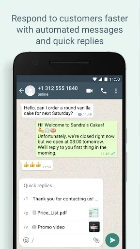 • Work smarter. Save time by letting the app do the work for you! Send customers automated quick replies and away messages so you never miss an opportunity. Use labels to quickly organize, filter, and find important conversations. Create a status to share an offer or news, and even take orders and payments** in-app to create a great customer experience.